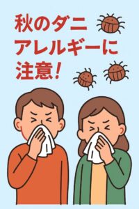 秋のダニアレルギーに注意!10月〜11月に症状が悪化する理由と対策秋にダニアレルギーが悪化するのはなぜ?・夏に増えたダニの死骸やフンが原因夏の間に増えたダニは、秋になると気温の低下で死んでしまいます。でも、その死骸やフンが部屋のホコリに混ざって空気中に舞い上がることで、アレルギーの原因になるんです。秋はダニそのものよりも、“ダニの残骸”に注意が必要です。・気温・湿度の変化でホコリが舞いやすくなる秋は空気が乾いていて、掃除や衣替えのときにハウスダストが舞い上がりやすい季節。特に、布団やカーペットを動かすと、アレルゲンが一気に広がることがあります。・乾燥で鼻や喉が敏感になる秋の乾いた空気で、鼻や喉の粘膜が弱くなり、アレルゲンが入りやすくなります。そのため、夏よりも症状が出やすくなるんです。対策ポイント・布団やシーツは週1回以上洗濯・乾燥・掃除機は布団ノズルでしっかり吸引・除湿機・加湿器で湿度を40〜60%にキープ・アレルギー症状がつらい時は、薬局で抗ヒスタミン薬や点鼻薬を相談【参照】・一般社団法人 日本アレルギー学会<記事を書いたライター>本記記事は薬剤師資格を持った「Medical Web Design」の運営担当が執筆しております。<Medical Web Designとは>薬局・クリニック等の医療機関専門のHP制作会社です。医療×ITを目指したサービスで「保守管理」「健康記事更新」「Googleマップ対策」等一貫して対応可能です。HP制作をお考えの方は↓をクリック。「Medical Web Design」 秋バテ、放っておかないで!今できる事で乗り切る方法前の記事