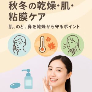 | なぜ秋冬は乾燥しやすいの? 秋から冬にかけては湿度が50%を下回りやすく、肌や粘膜の水分が奪われやすくなります。 さらに暖房やマスク生活で、皮膚バリアが弱まり、肌荒れや喉の痛みが起こりやすくなります。 肌・粘膜が乾燥するとどうなるの? 皮膚や粘膜は「外敵から体を守る防波堤」です。 乾燥してひび割れると、ウイルスや細菌が入り込みやすくなります。 感染症や口内炎の原因にもなるため、保湿は見た目だけでなく健康維持にも大切です。 ① 保湿剤の上手な使い方 肌の乾燥対策の基本は「保湿」です。 ハンドクリーム・ワセリンなどの保湿剤を活用しましょう。 効果的な使い方のコツは、入浴や手洗いのあと、肌が少し湿っている状態で塗ること。 こうすることで、水分をしっかり閉じ込め、長時間しっとり感が続きます。 ② のど・鼻の粘膜を守るケア 冬は空気が乾燥し、のどや鼻の粘膜のバリア機能が低下しやすくなります。 薬局で販売しているうがい薬、スプレータイプののど薬、のど飴などのアイテムを使ったケアが効果的です。 ③ 保湿マスク・加湿器などのセルフケア用品を活用 乾燥が気になる時期は、空気中の湿度を保つことも大切です。 保湿マスクや加湿器、鼻うがい用品などのセルフケア用品で、こまめにケアするのもおすすめです。 肌のかさつきや喉のイガイガを「季節のせい」と思っていませんか? 実は、乾燥は美容の問題だけでなく、体調の変化を知らせる健康のサインでもあります。 乾燥によって肌のバリア機能が低下すると、かゆみや炎症が起こりやすくなり、 喉や鼻の粘膜が弱ることで風邪や感染症にもかかりやすくなることがあります。 「最近、肌が荒れやすい」「喉の違和感が続く」と感じたら、自己判断せず、薬局で相談してみましょう。